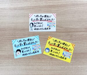 キャッチコピーや、かわいいイラスト入りのPOPカード。手書きでPOPカードを作って、商品の魅力を伝えよう。