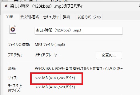 <パターン①> ビットレート128kbpsで出力した場合⇒3.88MB